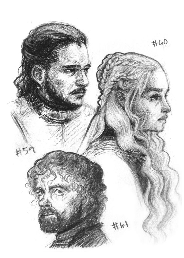 Det starta med utfordringa #meds100heads. Dette var rett før siste sesong av Game of Thrones, og etter nr. 40 gjekk eg over frå referansebileta som fulgte med utfordringa til å teikne GoT-karakterer. Fokuserte meir på portrettlikskap enn planlagt, kvar teikning tok mellom 10-45 min, og eg endte med 100 hovud på 15 dager.